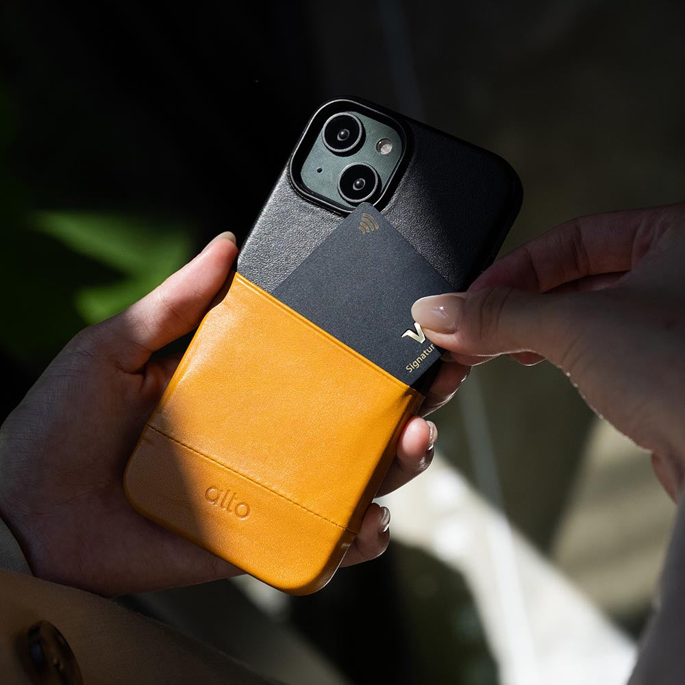 iPhone 14/iPhone 16e - Metro 插卡皮革手機殼 - 焦糖棕/渡鴉黑
