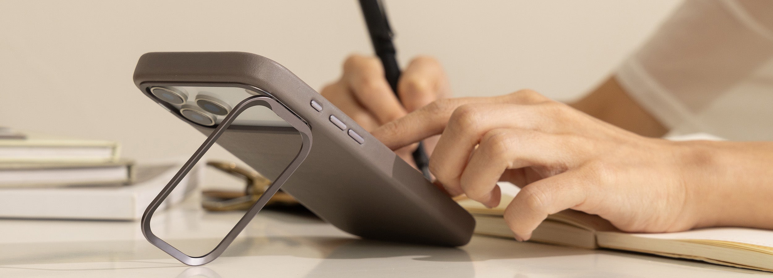 簡約新設計,義大利皮革包覆搭配金屬鏡頭支架,無論追劇、查看訊息或視訊,都能輕鬆掌握。