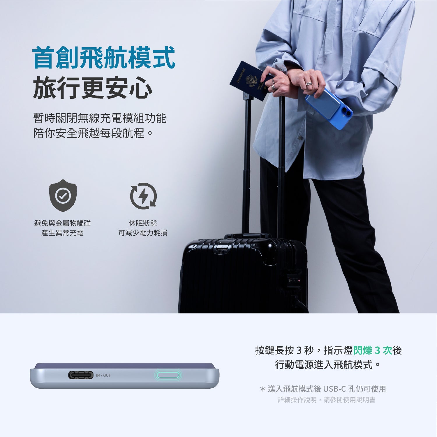 首創行動電源飛航模式,提升旅行移動以及飛機搭乘時的安全保護。